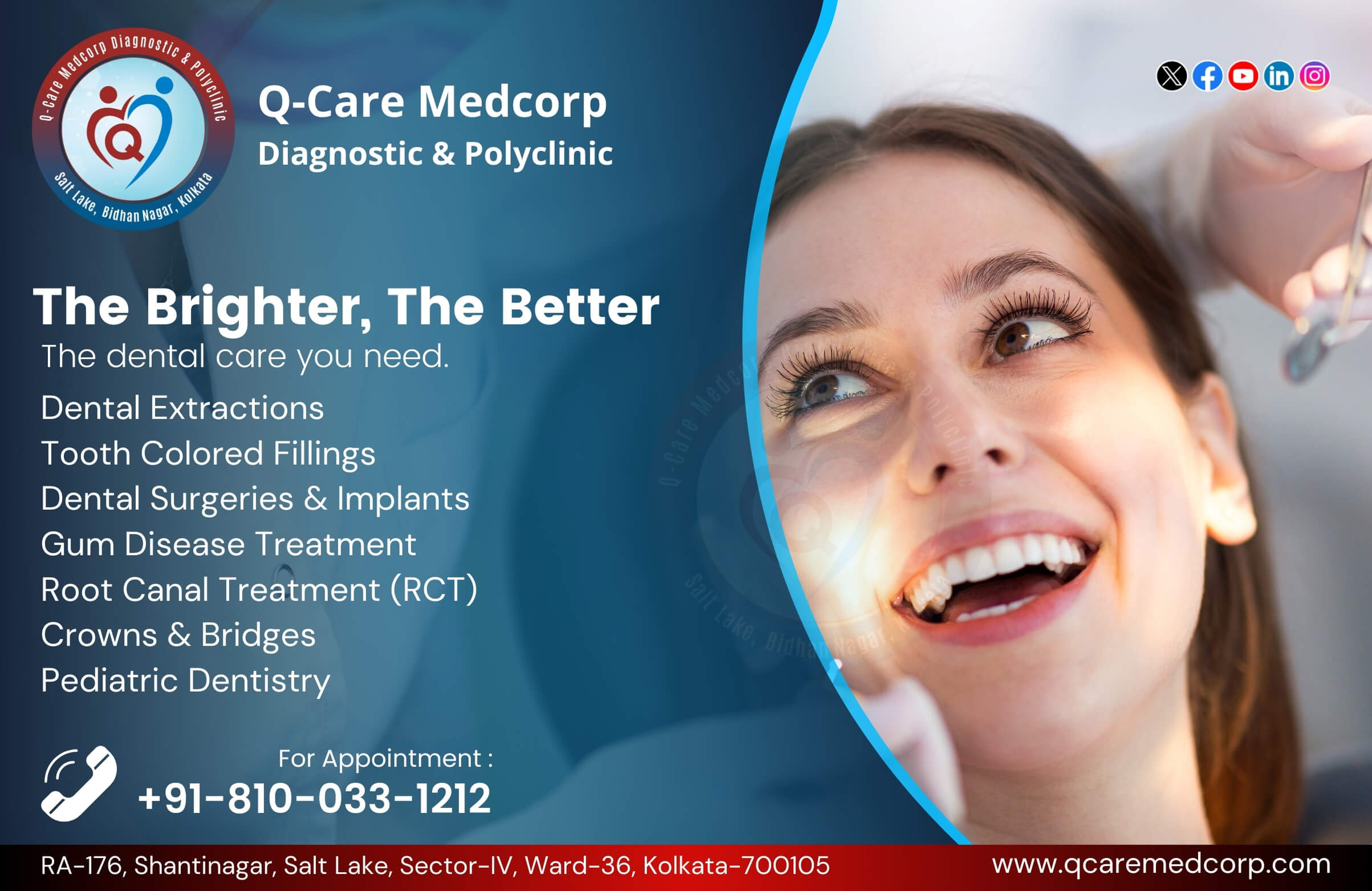 Located in Salt Lake, Bidhannagar, Kolkata, Q-Care Medcorp Diagnostic & Polyclinic has earned a reputation as one of the leading dental clinics in the region. We offer a wide range of services, from routine cleanings and exams to complex cosmetic procedures and dental surgeries, all with an emphasis on comfort and care. We understand that many people fear visiting the dentist, which is why we prioritize creating a relaxing and stress-free environment. Our team works to ease any concerns and provide patients with the highest level of care in a safe and welcoming space.